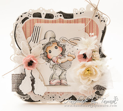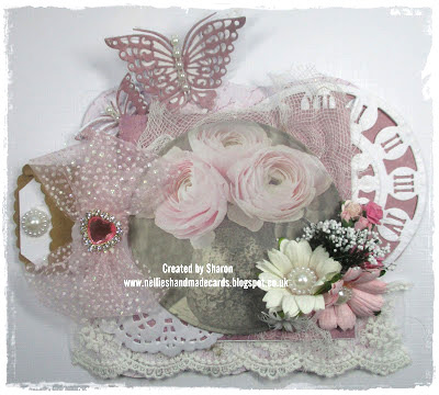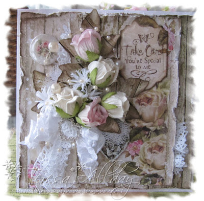 (Mary made a folding decorative corner card with a tea bag tag and added 6mm ivory flat back pearl string, 7mm dusky pink satin ribbon, a pale pink ballerina blossom, 30mm pale pink wild roses, 10mm and 20mm pale pink open roses, some 25mm rose leaves, a white lily flower and some 8mm white rice rac)