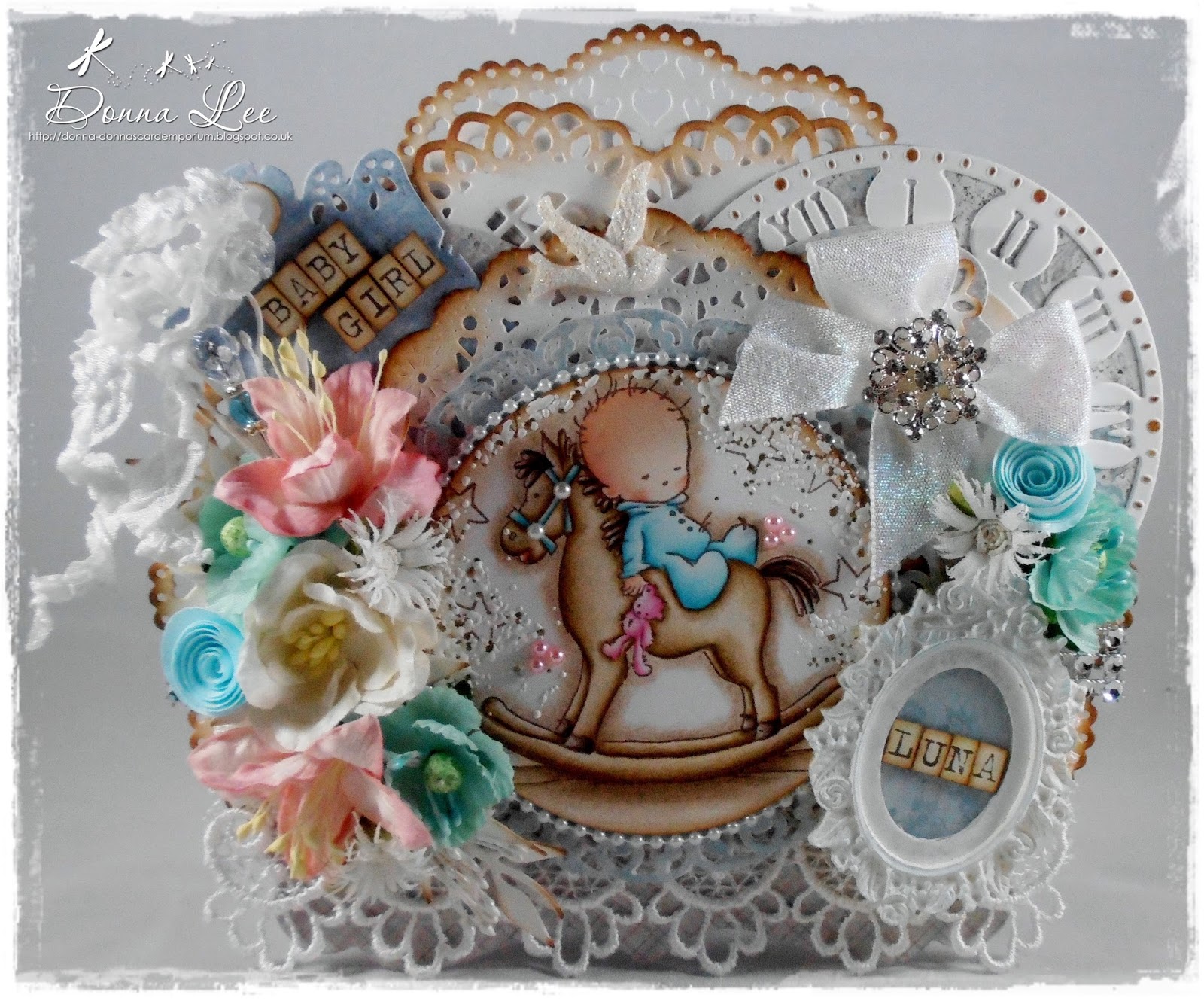 (Donna Used; 45mm 'Jessica' White Guipure Lace, White Mermaid Sparkle Ribbon, 5 Metres White Seam Binding, Faux 6-row Diamante trim, Ivory White Magnolia Flowers, Lily Flowers Med/Large pale Pink, Chrysanth White Kort & Godt, Rolled Paper Flowers - Aqua Roses Kort & Godt, Fabric Blossom Aqua With Stalk, 1mm Pearlised Stamens Pk Of 144, Resin Cameo Roses Frame Flatback, Ivory Resin Dove, 20mm 'Starburst' Diamante Embellishment, Princess Pin Aqua, 3mm White Pearl Bead String, 3mm White s/a Pearl Flatbacks and 3mm Sugar & Spice s/a Pearl Flatbacks)
