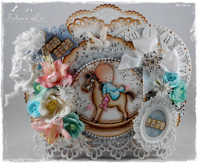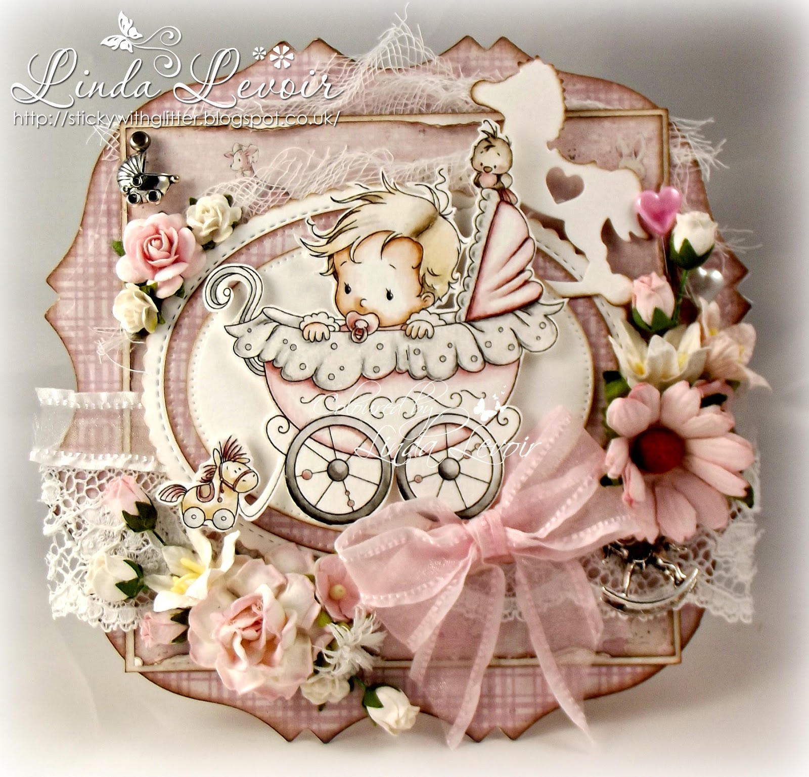 (Linda used: Baby Pram Charm, Cheesecloth, Pale Pink 20 mm Open Rose, Ivory 10 mm Open Rose, White Ruffle Edge Sheer Ribbon, Charlotte Elizabeth White Lace, Hip Rose Bud White , Small White Lily, 30 mm Pale Pink Trellis Rose, Chrysanth White K & G, Sweetheart Blossom Baby Pink & White, Pink Ruffle Edge Sheer Ribbon, Daisy Pale Pink, Small Pale Pink Lily, White Heart Pin, Pink Heart Pin)