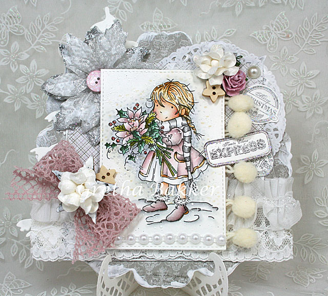 Gretha used: 32mm 'Nicole' Ivory Vintage Style Fine Lace, 30mm Shabby White Ruffled Ribbon, FB 6mm Pearl White Trim, Poinsettia Silver shimmer, Pk of 10 Pale Pink Small Polka Dot Spotty Buttons, Wooden Star Buttons, Pom Pom Trim, White Pretty Bloom, Lilac 20mm Open Rose, 6mm pearl Ivory Flat Backs