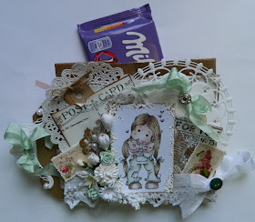 (Tiets used: seambinding wavecrest and white,, cheesecloth, 18mm and 30 mm white zigzag cotton lace,dark green and naturel button twine,chrysanth white kort & godt,beaded sprig white, open rose 10 mm white,Carnation off white,tulip flower white,Lily flower white,Rose buds hip white,teardrop pins white pearlised9 mm white/white spot organza, polka small dot button dark green,diamante round spacer 13mm,8mm round clear acrylic gems)